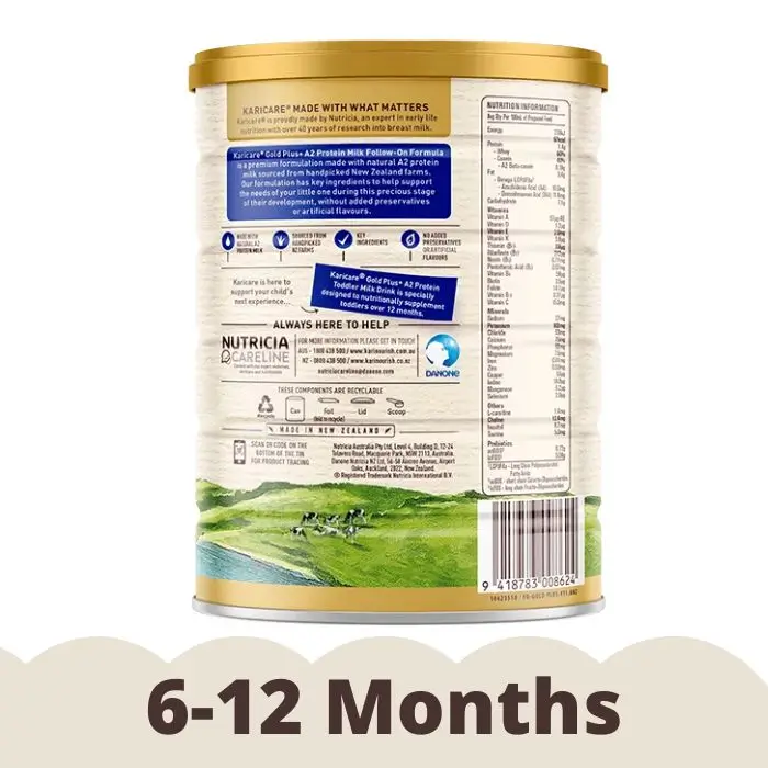 Milk solids, vegetable oils (emulsifier (soy lecithin), antioxidant (ascorbyl palmitate)), short chain galacto-oligosaccharides (milk), dried omega LCPUFAs (fish oil, antioxidant (sodium ascorbate, mixed natural tocopherols, ascorbyl palmitate)), long chain fructo-oligosaccharides, taurine, choline chloride, inositol, L-carnitine. Minerals: Potassium, calcium, chloride, phosphorus, sodium, magnesium, iron, zinc, copper, iodine, manganese, selenium. Vitamins: Vitamins (A, B1, B2, B3, B5, B6, B12, C, D3, E, K1), folic acid, biotin.Karicare Gold Plus+ A2 Protein Milk Follow-On Formula is based on cow's milk protein.