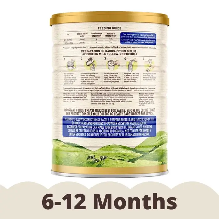 5. Test temperature on wrist before feeding. Feed immediately (do not store). Discard unfinished feeds. Prepare each bottle separately. It is safer to use Karicare Gold Plus+ A2 Protein Milk Follow-On Formula immediately after it is prepared.